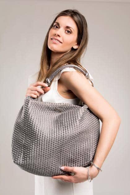Sack bag in lurex fabric with handle to carry by hand or under the shoulder and long shoulder strap.