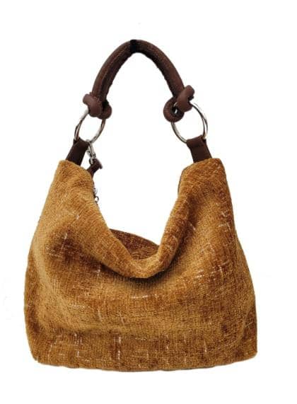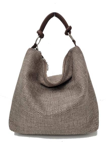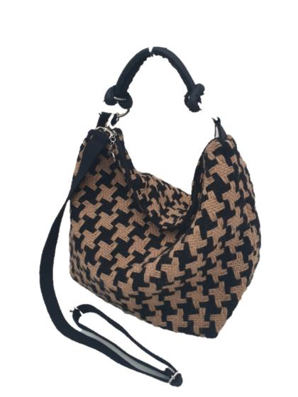 Woven wool bag with brown eco-leather handle and shoulder strap. Black lining with double pocket, one zip pocket