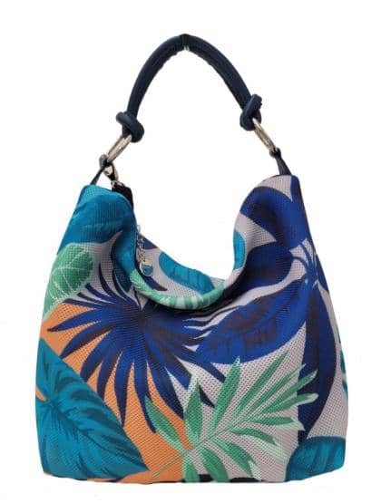 Soft printed fabric bag, eco-leather handle and shoulder strap. Zip closure, large and lightweight bag. Black internal lining with double pocket, one zip pocket