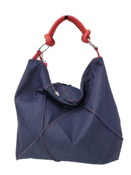 Duffle bag in dark denim fabric with red handle and red stitching. Long shoulder strap, lining with double pocket. Lightweight and comfortable bag
